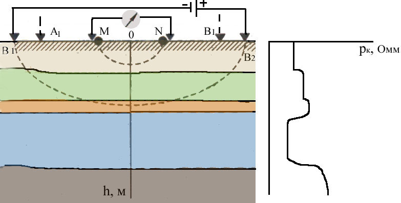 Электроразведка – метод исследований, основанный на измерении кажущихся сопротивлений грунтов по глубине (ρ2>ρ1). Два заземления (штыря) подключаются к полюсам источника постоянного тока. Прибором измеряется разность потенциалов между ними. Чем дальше друг от друга заземления (больше разнос), тем больше глубина исследования. Измеряется в Ом/м.