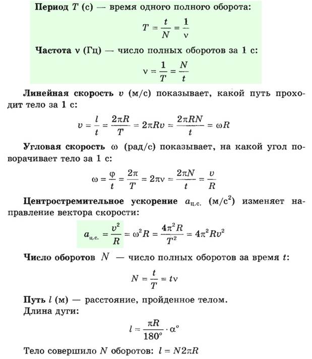 Период Т (с) – время одного полного оборота. Частота v (Гц, греческая буква "ню") – число полных оборотов за 1 с. Эти два параметра также встретятся вам в теме "Колебания и волны", формулы будут те же. Формулу ускорения надо запомнить сейчас. Всё остальное выводится из математических соображений: надо знать формулу длины окружности, что такое угол в градусах и в радианах.