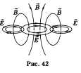 Английский ученый Джеймс Максвелл на основании изучения экспериментальных работ Фарадея по электричеству высказал гипотезу о существовании в природе особых волн, способных распространяться в вакууме. Эти волны Максвелл назвал электромагнитными волнами. По представлениям Максвелла: при любом изменении электрического поля возникает вихревое магнитное поле и, наоборот, при любом изменении магнитного поля возникает вихревое электрическое поле. Однажды начавшийся процесс взаимного порождения магнитного и электрического полей должен непрерывно продолжаться и захватывать все новые и новые области в окружающем пространстве (рис. 42). Процесс взаимопорождения электрических и магнитных полей происходит во взаимно перпендикулярных плоскостях. Переменное электрическое поле порождает вихревое магнитное поле, переменное магнитное поле порождает вихревое электрическое поле.