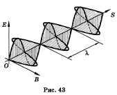 При распространении электромагнитной волны векторы напряженности Е и магнитной индукции В перпендикулярны направлению распространения волны и взаимно перпендикулярны между собой (рис. 43).