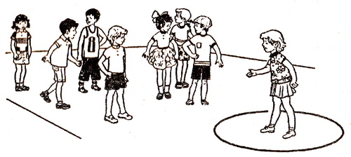 Сидящие игроки внутри круга стараются поймать летящий мяч. Важно - при этом нельзя вставать с корточек в полный рост, можно только пытаться подпрыгнуть, не вставая в полный рост. Если кому-то из игроков удалось поймать мяч, то все «наказанные» возвращаются в игру, а игрок, бросавший мяч, занимает их место.