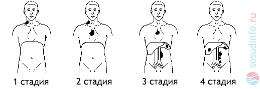 Стадии лимфомы и области поражения. На 3 и 4 стадии воспаленные узлы появляются ниже линии диафрагмы