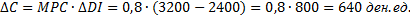 В прошедшем году располагаемый доход домохозяйства был равен 2400 ден. ед., в текущем – 3200 ден. ед. Если предельная склонность к потреблению равна 0,8, то прирост потребления в отчетном году составил ________ ден. ед.