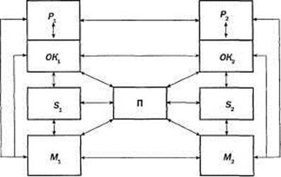 5, и 52 — стороны конфликта (субъекты конфликта); П — предмет конфликта; ОК1 и ОК2 — образы предмета конфликта (конфликтной ситуации); М1 и М2 — мотивы конфликта; Р1 и Р2 — позиции конфликтующих сторон.
