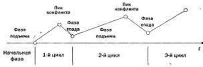 Важно помнить, что фазы конфликта могут повторяться циклически. Например, после фазы спада в 1-м цикле может начаться фаза подъема 2-го цикла с прохождением фаз пика и спада, затем может начаться 3-й цикл и т. д. При этом возможности разрешения конфликта в каждом последующем цикле сужаются. Описанный процесс можно изобразить графически (рис. 2.3):