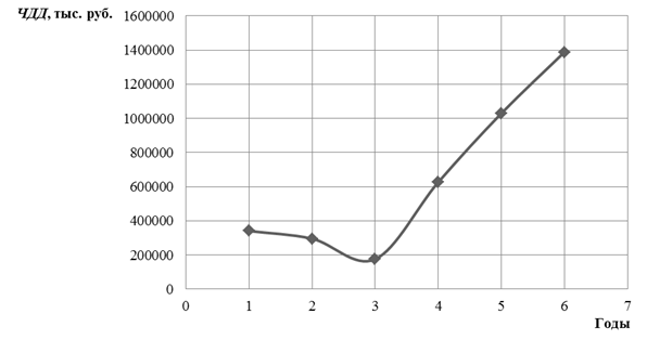 Пересечение графика с осью времени показывает срок окупаемости капитальных вложений, т.е. в этой точке