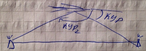 Полет по внутреннему створу легко выполнять, когда стрелки обеих радиостанций вынесены на один индикатор (например, РМИ или УШ). В этом случае для определения стороны уклонения даже не обязательно отсчитывать значения курса и курсовых углов, да и вообще шкала не нужна. Сторона уклонения легко определяется по взаимному положению стрелок. Используется следующее простое мнемоническое правило.
