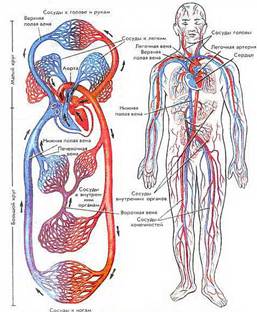 Кровь выталкивается из левого желудочка и направляется в главную кровеносную магистраль аорту. Из нее по все более ветвящимся сосудам (артериям, артериолам, капиллярам) она поступает во все органы тела, в мышцы, кишечник, мозг и т.д. исключение составляют легкие. Из капилляров питательные вещества, находящиеся в крови, попадают в клетки организма; здесь кровь отдает кислород, и взамен получает углекислый газ и другие отходы жизнедеятельности. Далее идет обратный процесс: кровь из капилляров поступает в посткапилляры, венулы, вены, верхнюю и нижнюю полые вены и поступает в правое предсердие. Так завершается большой (или телесный) круг кровообращения. После этого кровь из правого предсердия направляется в правый желудочек, откуда берет начало малый (или легочный) круг кровообращения. Кровь из правого желудочка выталкивается в легочную артерию и по ней поступает в легкие, где опять-таки крупные кровеносные сосуды измельчаются до сети капилляров, доставляя венозную кровь в легочные альвеолы. В альвеолах кровь отдает углекислый газ и насыщается кислородом, а оттуда по все укрупняющимся сосудам снова попадает в сердце –в левое предсердие. Этим замыкается малый круг кровообращения, и после поступления крови в левый желудочек начинается очередной цикл движения крови в теле. Таким образом, неутомимый труженик – сердце – днем и ночью сокращается и гонит кровь по всем клеточкам нашего тела. Сердце человека весит 400-450 грамм. Каждый час оно сокращается 4200 раз и перекачивает около 300 литров крови. За сутки через сердце проходит около 7200 литров крови. При каждом сокращении сердце выбрасывает 70 мл крови в аорту и столько же в легочную артерию.