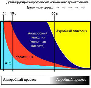 Запасов АТФ достаточно только на первые 2-3 секунды двигательной активности, однако мышцы могут работать только при наличии АТФ. Для этого существуют специальные системы, которые постоянно синтезируют новые молекулы АТФ, они включаются в зависимости от продолжительности нагрузки (см. рисунок). Это три основные биохимические системы:
