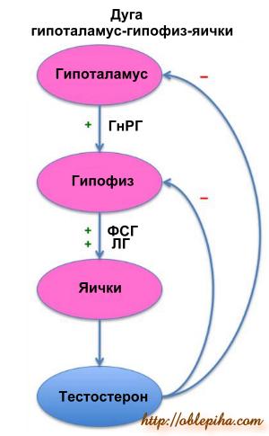 Механизм синтеза тестостерона можно рассмотреть на так называемой «Дуге гипоталамус-гипофиз-яички».