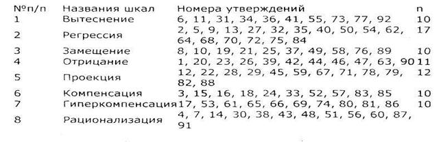 Восемь эго-защитных процессов формируют восемь отдельных шкал, численные значения которых выводятся из числа положительных ответов на определенные указанные ниже утверждения, разделенных на число утверждений в каждой шкале. Напряженность психологических защит подсчитывается по формуле (число «+» / n -число утверждений) х 100%