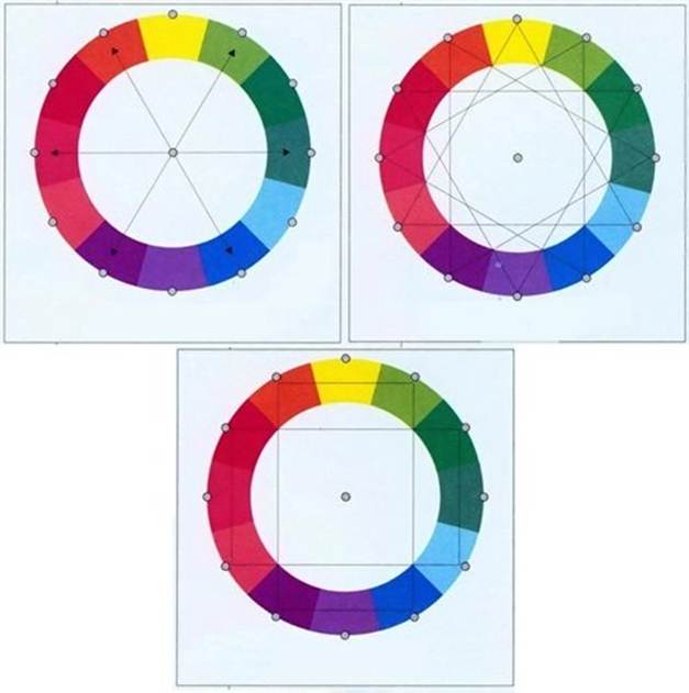 2. Цвета, которые находятся под углом 90 градусов друг с другом (например, желтый и красно-оранжевый, синий и фиолетовый, красный, зеленый и оранжевый, и т.д.)