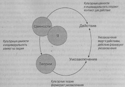 атских культурах между тем предполагается, что причины следует искать в действиях групп пли обстоятельствах, а ориентация Восточной Азии на сохранение гармонии может в результате привести к решению о коллективной ответственности. Ценности и Я-концепции играют двойственную роль. Во-первых, они оказывают влияние на формирование представлений, которые, в свою очередь, лежат в основе умозаключений; во-вторых, они определяют контекст, в котором итоговые умозаключения воплощаются в действия (рис. 13.1). В соответствии с этой схемой вопрос о том, какой из трех подходов является «наилучшим» для изучения культуры и умозаключений, теряет смысл. Более правильно будет сказать, что объектом исследования каждого из подходов является определенный аспект влияния культуры на умозаключения. Выделение определенного комплекса взаимосвязей (например, между теориями и умозаключениями или между ценностями и теориями) имеет практический смысл, и, вероятно, является неизбежным приемом в процессе исследования, но теперь ученые вооружены достаточным количеством знаний, чтобы признать существование более широкой системы взаимосвязей между культурой и умозаключениями. И целостное представление о том, как культура влияет на умозаключения, должно включать все эти составляющие.