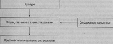 Достаточно очевидно, что в целом принципу справедливости оказывается большее предпочтение в индивидуалистических культурах, но взаимосвязь культуры и распределения вознаграждения в коллективистских культурах представляется достаточно сложной и характеризуется множеством ситуационных переменных (James, 1993). Схема индивидуализм-коллективизм не позволяет полностью объяснить эмпирические данные. Для решения этой проблемы Лейиг (Leung, 1997) в качестве альтернативы предложил контекстуальную модель; данная модель предполагает, что культура взаимодействует с рядом ситуационных переменных, и это взаимодействие определяет использование тех или иных принципов распределения. При этом учитываются и задачи в процессе распределения (например, Deutsch, 1975; Leung & Park, 1986). Было высказано предположение, что непосредственное влияние на выбор принципа распределения оказывают задачи, связанные с взаимоотношениями, опосредующие воздействие культуры. Поскольку индивидуализм-коллективизм не является непосредственной детерминантой подхода к распределению, возможно, данная модель позволит решить проблемы, которые возникли при попытках использования данного конструкта для интерпретации разЛичий в поведении при распределении. Модель схематически представлена на рис. 19.2.