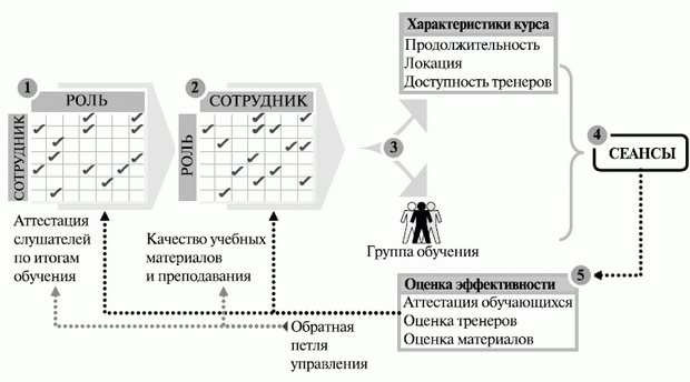 Зная информацию об общей продолжительности курсов, необходимо определить время сессий обучения и назначить даты их проведения. Результатом являются сформированные комбинации курсов, слушателей и установленной даты проведения курсов. Таким образом, процесс планирования обучения, реализуемый на этапе проектирования, схематично может быть представлен (см. рис. 11.2).