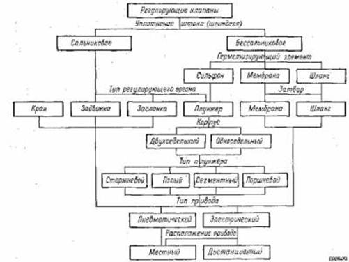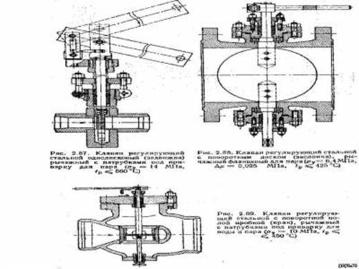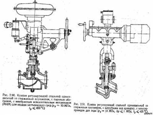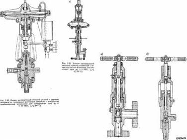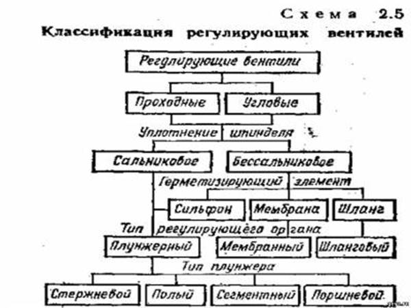 При помощи вентиля производится только периодическое ступенчатое регулирование. Непрерывное и бесступенчатое регулирование осуществляется при помощи регулирующих клапанов, снабженных приводом. Они являются исполнительным устройством в системе автоматического регулирования технологических процессов. Регулятор давления представляет собой автоматически действующее автономное устройство, состоящее из регулирующего клапана, снабженного приводом, управляемым чувствительным элементом, реагирующим на давление рабочей среды, без применения постороннего источника энергии. Классификация регулирующих вентилей и клапанов приведена на схемах 2.5 и 2.6, а их типовые конструкции — на рис. 2.85—2.97.