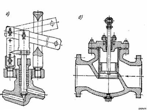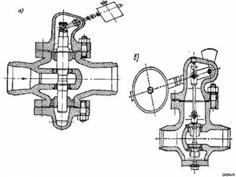Рис, 2.86. Клапаны регулирующие стальные двухседельные рычажные с патрубками под приварку для воды и пара (Ру = 2,5 МПа, < 400 °С): а - со стержневым плунжером; б — с полым плунжером