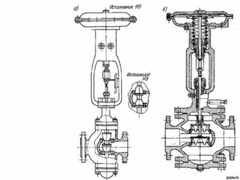 Регулирующие клапаны могут иметь вид действия НО (нормально открыт) или НЗ (нормально закрыт) в зависимости от того, открыт или закрыт клапан при отсутствии давления на мембране привода.
