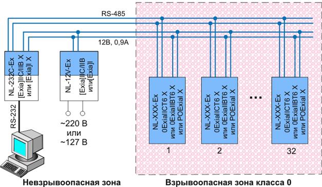 Искробезопасные устройства могут быть расположены как внутри взрывоопасной зоны, так и вне ее (рис. 7.1). Связанное оборудование может располагаться только вне взрывоопасной зоны, но его искробезопасные цепи могут идти внутрь взрывоопасной зоны (на рис. 7.1 искробезопасными являются цепи интерфейса RS-485 и питания 12 В, 0,9 А).