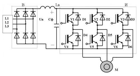 Таким образом, при дросселировании поток вещества, сдерживаемый задвижкой или клапаном, не совершает полезной работы. Применение регулируемого электропривода насоса или вентилятора позволяет задать необходимое давление или расход, что обеспечит не только экономию электроэнергии, но и снизит потери транспортируемого вещества. Структура частотного преобразователя Большинство современных преобразователей частоты построено по схеме двойного преобразования. Они состоят из следующих основных частей: звена постоянного тока (неуправляемого выпрямителя), силового импульсного инвертора и системы управления. Звено постоянного тока состоит из неуправляемого выпрямителя и фильтра.