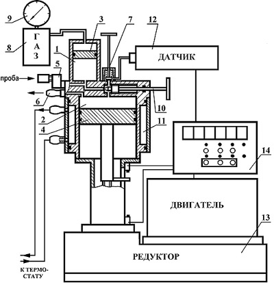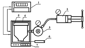 | 1 - термостат; 2 - пресс; 3 - пробоотборник; 4 - терморубашка; 5 - камера разгазирования; 6 - датчик давления; 7 - весы. |