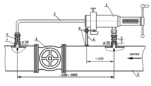 1 - прибор УОСГ-1 РГ; 2 - гибкий рукав высокого давления; 3 - трубопровод; 4 - секущая задвижка; 5 - пробоотборные краны; 6 - шпилька М 12; 7 - входной и выходной штуцера; 8 - гайка М 12. По МИ 3035-2007 с прибором УОСГ-1РГ