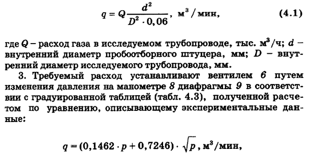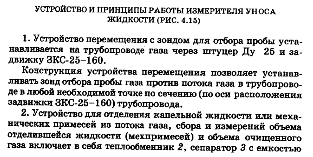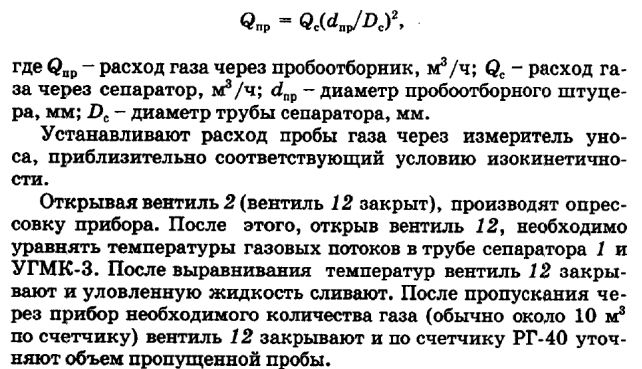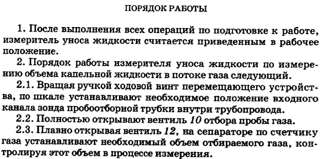 Для начала процесса измерения задвижка на газопроводе открывается, каплеуловитель вводится на необходимую глубину в трубу и разворачивается входным отверстием навстречу потоку. Затем, с помощью регулятора, устанавливается расход газа в пределах 0,04÷6 м3/ч (для обеспечения изокинетичности отбора) и делается выдержка в течение времени, которое необходимо для улавливания не менее 0,5÷10 Г жидкости. После этого пробозаборник поднимается вверх, задвижка закрывается, пробозаборник отсоединяется, фильтрующий элемент вынимается и взвешивается.