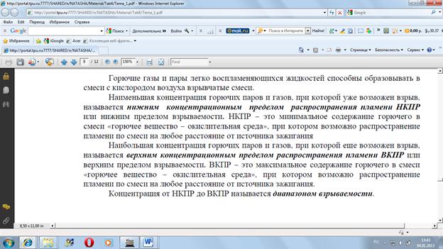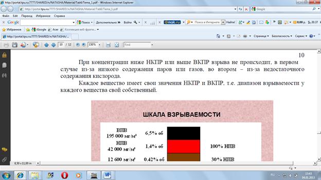 Для смесей горючей пыли с воздухом величину НКПР принято измерять в кг/м3, для смесей горючего газа или пара с воздухом – в % (об.). Понятие ВКПР на пыли не распространяется.