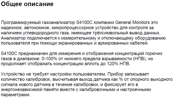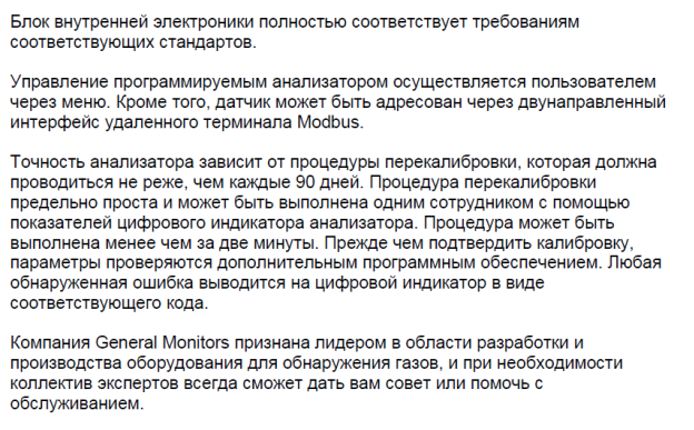 Датчики горючих и углеводородных газов General Monitors основываются на оригинальных фирменных решениях в области конструирования, выбора материалов и технологии изготовления и обеспечивают высокую скорость срабатывания и точность измерений. Широкая гамма датчиков с использованием каталитического шарикового сенсора или ИК чувствительного элемента предоставляют возможность выбора метода детектирования, наиболее пригодного для каждого конкретного применения. Предлагаемое фирмой оборудование способно удовлетворить специфические требования самых разных областей применения, таких как добывающие платформы, топливно-наливные комплексы, компрессорные станции, нефтяные бурильные установки, газовые турбины и многих-многих других