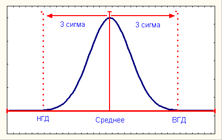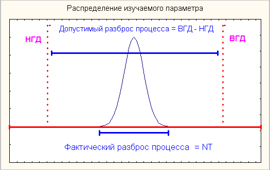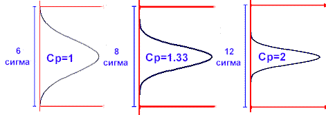 Воспроизводимый процесс, в основе которого лежит стабильное нормальное распределение, теоретически дает в результате 0,27% изделий с параметрами, выходящими за пределы допусков. Значение 1,0 было выбрано для демонстрации связи Cp со стандартным шестисигмовым отклонением, используемым в контрольных картах. Если процесс точно воспроизводим, то: