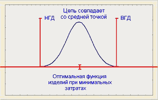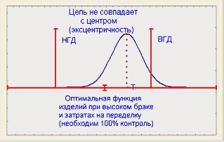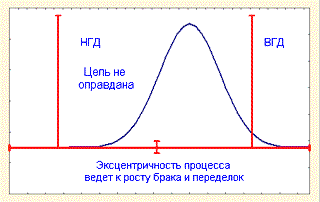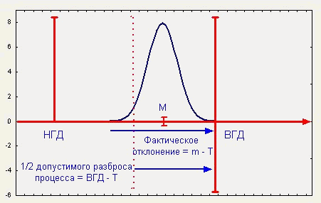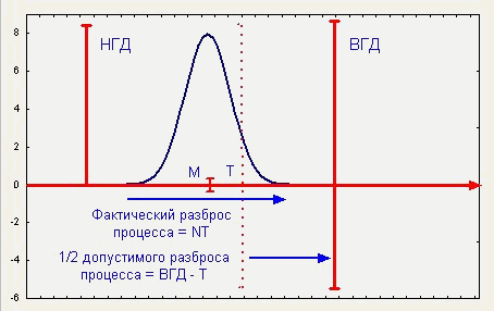 Есть множество способов распространения введенных показателей воспроизводимости на случай целевого значения (номинала). Следующее расширение использует аналогию между фактическим и допустимым разбросами процесса, которая показана на рис. 1. Показатель потенциала процесса связывает фактический разброс процесса с допустимым. Из рис. 8 для ближайшего к ВГД значения Т имеем: