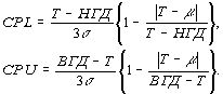 Обратите внимание, что СPL =0, если | Т -m | > T -НГД, и CPU =0, если | Т -m | >ВГД- T. Эти показатели можно использовать при односторонней границе допуска с целевым значением. Вышеприведенные уравнения аналогичны (8) для Cpk и соответственно CPL и CPU, при условии, что Т =m.