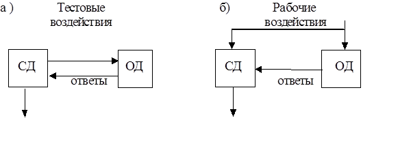 Диагностирование осуществляется с помощью тех или иных средств диагностирования (СД). Выделяют встроенные и внешние СД. Встроенное средство диагностирования (контроля) – средство диагностирования (контроля), являющееся составной частью объекта. Внешнее средство диагностирования – средство диагностирования (контроля), выполненное конструктивно отдельно от объекта. Взаимодействующие между собой ОД и СД образуют систему диагностирования. Процесс диагностирования, в общем случае, представляет собой многократную подачу на ОД определенных воздействий (входных сигналов), многократных измерений и анализа ответов на них. Воздействия могут формироваться СД либо определяться непосредственно алгоритмом функционирования ОД. Различают системы тестового и функционального диагностирования. Особенность первых состоит в возможности подачи на ОД специально организованных (тестовых) воздействий от средств ОД. В системах второго типа диагностирование ведется на рабочих воздействиях, предусмотренных рабочим алгоритмом функционирования ОД. На рис. 1.2 (а и б) приведены обобщенные функциональные схемы систем тестового и функционального диагностирования соответственно. Системы функционального диагностирования обычно обеспечивают контроль ОД в процессе его применения по назначению, тестового – при производстве и ремонте.