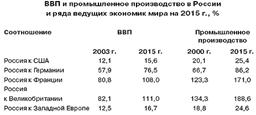 Доля России в мировом ВВП в 2000 году была равна всего 2,1 %, в 2015 году почти 3 %,что вдвое меньше, чем в 1913-м. Ориентировочное сопоставление ВВП и объемов промышленного производства во всех сравниваемых странах показывает, что к 2015 году Россия не достигнет тех соотношений по ВВП с США, которые она имела в 1913 году, но заметно приблизится к Германии и превзойдет Великобританию и Францию. Тем не менее, по размеру ВВП входит в десятку крупнейших промышленно-развитых стран мира. В перспективе до 2015 среднегодовой темп роста ВВП составит, скорее всего, порядка 5 %. Есть основания полагать, что в экономике России уже начался процесс перехода к постиндустриальной стадии.