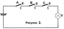 2) Если закрытые двери на первом этаже обозначить как А = 1, на втором В = 1, на третьем С = 1, возможность вызвать лифт обозначить как F = 1, а логическую функцию И обозначить знаком умножения "×", то алгебраическое выражение будет иметь вид: F = A×B×C