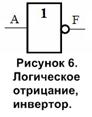 Наиболее часто встречаются следующие названия этой функции: логическое отрицание, инверсия, дополнение, NOT, НЕ. Возможные виды алгебраической записи функции НЕ. Электронная схема выполняющее действие логического отрицания называется инвертер ом (рис 6).Операция не обозначается подчеркиванием над обозначением высказывания, поэтому алгебраическая запись может быть представлена в виде не(А)=F=Ā. айтылымның үстіне сызықша салумен белгіленеді. дың алгебралық өрнегі.Таблица истинности операции не показана в таблице 5. Здесь А некоторое произвольное высказывание.