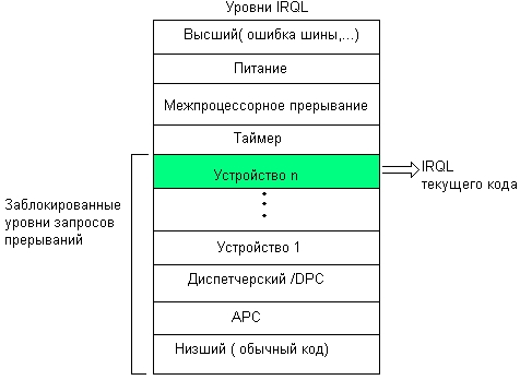 Прерывания от внешних устройств занимают промежуточные уровни IRQL. Конкретное соотношение между приоритетами внешних устройств определяется приоритетами, задаваемыми аппаратной платформой, например уровнем IRQ шины PCI, назначенным устройству.