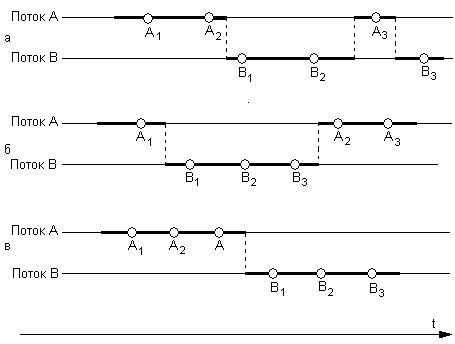 Выполнение потока в мультипрограммной среде всегда имеет асинхронный характер. Очень сложно с полной определенностью сказать, на каком этапе выполнения будет находиться процесс в определенный момент времени. Даже в однопрограммном режиме не всегда можно точно оценить время выполнения задачи. Это время во многих случаях существенно зависит от значения исходных данных, которые влияют на количество циклов, направления разветвления программы, время выполнения операций ввода-вывода и т. п. Так как исходные данные в разные моменты запуска задачи могут быть разными, то и время выполнения отдельных этапов и задачи в целом является весьма неопределенной величиной.
