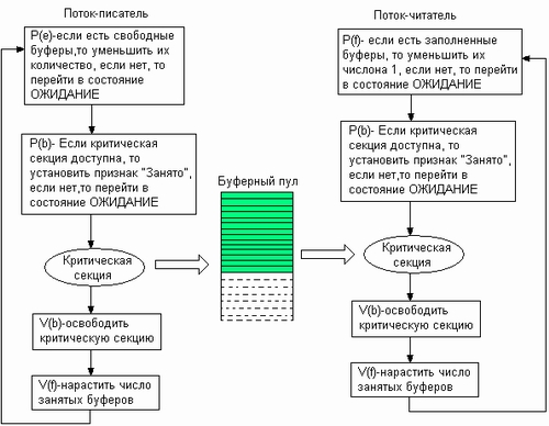 Поток-писатель прежде всего выполняет операцию Р(е), с помощью которой он проверяет, имеются ли в буферном пуле незаполненные буферы. В соответствии с семантикой операции Р, если семафор е равен 0 (то есть свободных буферов в данный момент нет), то поток-писатель переходит в состояние ожидания. Если же значением е является положительное число, то он уменьшает число свободных буферов, записывает данные в очередной свободный буфер и после этого наращивает число занятых буферов операцией V(f). Поток-читатель действует аналогичным образом, с той разницей, что он начинает работу с проверки наличия заполненных буферов, а после чтения данных наращивает количество свободных буферов.
