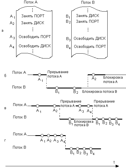 Рис. 4.22. Возникновение взаимных блокировок при выполнении программы