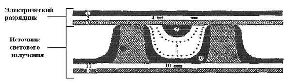 3-защитный слой; 4-разрядный электрод; 5-разряд; 6-ультрафиолетовое излучение;