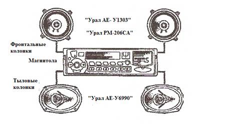 Подбирая акустику, желательно знать выходную мощность головного устройства, с которым она будет работать. Относительно этого параметра и выбираются головки. Максимальная мощность акустики должна как минимум в три раза превышать мощность головного устройства, а номинальная мощность акустики должна быть на 30 % больше мощности головного устройства. Только в этом случае можно избежать хрипов динамиков на большой громкости (если причина не кроется в головном блоке). В качестве иллюстрации всему сказанному приведем пример простой конфигурации (рис. 1.14), содержащей магнитолу и четыре колонки - две фронтальные и две тыловые, построенной на базе отечественной фирмы «Урал».