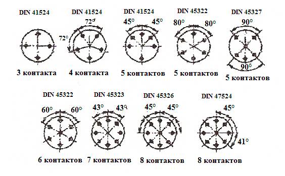 На рис. 1.18 показано расположение контактов соединителя 6-PIN-AV по стандарту DIN 45482 со стороны гнезд и их назначение.