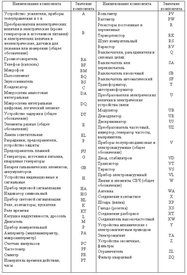 Таблица 1.1. Буквенные обозначения компонентов в электрических схемах