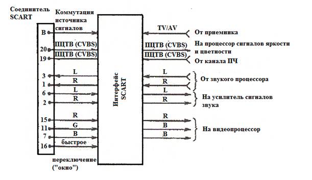 Рис. 1.22. Типовая схема включения интерфейса SCART в современных телевизорах с микропроцессорным управлением