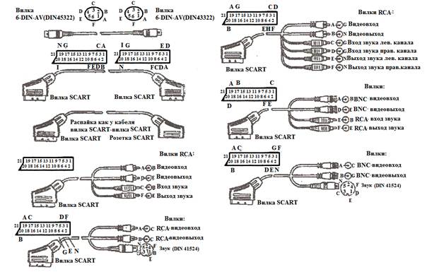Рис. 1.23. Конструкции наиболее распространенных вариантов соединительных кабелей для подключения видеоустройств к телевизорам