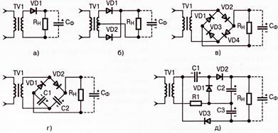 Схема рис. 2.1, д представляет собой утроитель напряжения Подобные схемы в основном используются в блоках питания такой БРТА, которая питается непосредственно от силовой сети с низким напряжением (110 или 127 В), а также в высоковольтных выпрямителях телевизоров для питания ускоряющего электрода кинескопа.