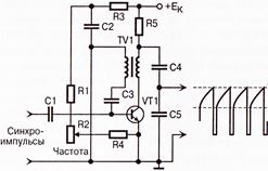 Этот простейший генератор открывает собой целый ряд так называемых релаксационных генераторов, в числе которых очень распространенным и широко применяемым является блокинг-генератор. До появления и широкого внедрения специализированных микросхем он являлся, пожалуй, единственным задающим генератором в схемах кадровой и строчной разверток всех телевизоров и видеомониторов. Такое предпочтение отдавалось блокинг-генераторам из-за их способности легко синхронизироваться, т.е. устанавливать свою собственную частоту генерации, в точности совпадающую с частотой внешних так называемых синхроимпульсов.