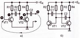 Рис. 2.17. Схема симметричного мультивибратора: а - иллюстрация принципа работы;
