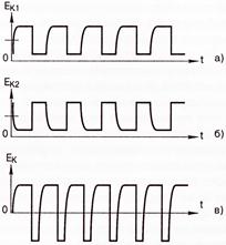 Рис 2.18. Форма генерируемого напряжения: а - на коллекторе первого транзистора; б - на коллекторе второго транзистора; в - при скважности, не равной 1
